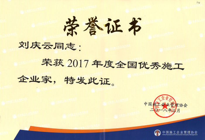 作為中國(guó)施工企業(yè)管理協(xié)會(huì)會(huì)員單位,建藝集團(tuán)參與了此次評(píng)優(yōu)活動(dòng),并獲得了“全國(guó)優(yōu)秀施工企業(yè)”稱(chēng)號(hào)及證書(shū),集團(tuán)領(lǐng)導(dǎo)劉慶云則獲得了“全國(guó)優(yōu)秀施工企業(yè)家”稱(chēng)號(hào)及證書(shū)。