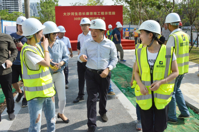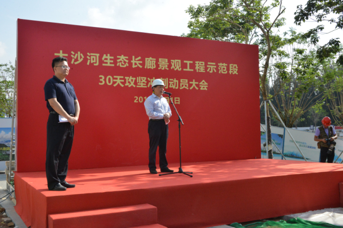 在其他項(xiàng)目相關(guān)單位代表依次登臺(tái)講話后,南山區(qū)城市管理局副局長(zhǎng)陳暉鵬作為建設(shè)單位代表登臺(tái)做總結(jié)動(dòng)員講話。他希望建藝集團(tuán)等單位能夠在最后關(guān)頭發(fā)揮出團(tuán)隊(duì)高效協(xié)作能力,從人員、物資、時(shí)間等各方面做好充分協(xié)調(diào),鼓足干勁,保質(zhì)保量在項(xiàng)目竣工節(jié)點(diǎn)前圓滿完成施工任務(wù),將大沙河生態(tài)長(zhǎng)廊景觀工程打造成“中國(guó)的塞納河”,樹(shù)立深圳“綠色生態(tài)示范工程”新標(biāo)桿!