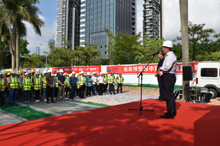 由于臨近項(xiàng)目竣工日期,在建設(shè)單位——南山區(qū)城市管理局及華潤(rùn)等項(xiàng)目相關(guān)單位的組織下,特召開(kāi)30天攻堅(jiān)沖刺動(dòng)員大會(huì)。劉海云董事長(zhǎng)作為項(xiàng)目建設(shè)總承包單位——建藝集團(tuán)代表登臺(tái)發(fā)表動(dòng)員講話。