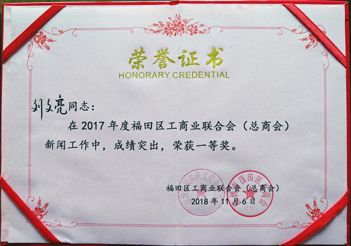 培訓(xùn)后,對(duì)2017年度福田區(qū)工商聯(lián)(總商會(huì))優(yōu)秀信息員進(jìn)行表彰并頒發(fā)榮譽(yù)證書(shū),建藝集團(tuán)榮獲福田區(qū)工商聯(lián)(總商會(huì))新聞工作第一名,這是建藝集團(tuán)連續(xù)第三年蟬聯(lián)桂冠。