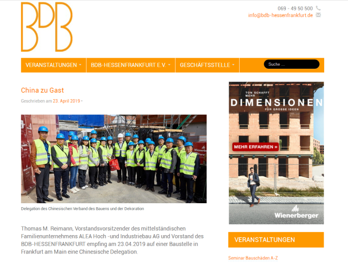 參觀交流活動結(jié)束后,德國聯(lián)邦建筑及建筑工程師協(xié)會——黑森州分會(BDB)在其官網(wǎng)bdb-hessenfrankfurt.de上對本次交流活動進(jìn)行了專門報道。