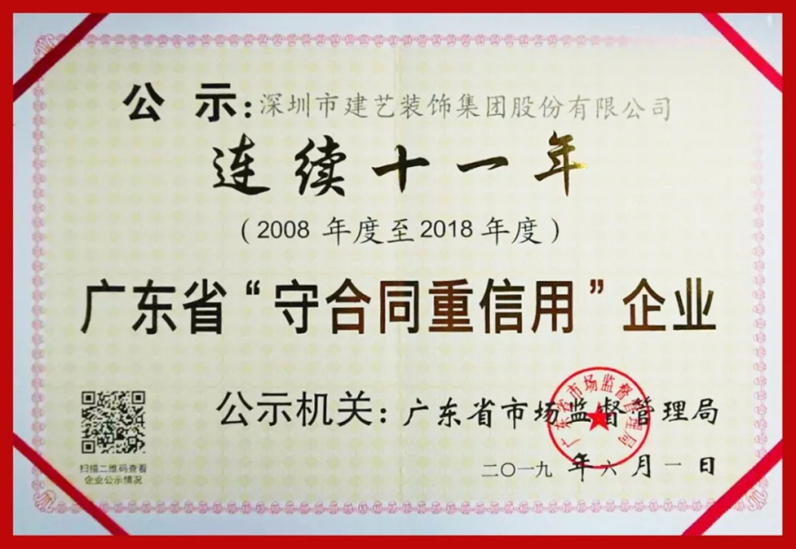 近日,廣東省工商行政管理局公示了2018年度廣東省“守合同重信用”企業(yè)名單。作為中國(guó)建筑裝飾行業(yè)百?gòu)?qiáng)企業(yè)第六名,建藝集團(tuán)憑借自身良好的信用體系建設(shè)及誠(chéng)信守約形象,再次登榜,連續(xù)11年榮獲廣東省“守合同重信用”企業(yè)榮譽(yù)稱(chēng)號(hào)!