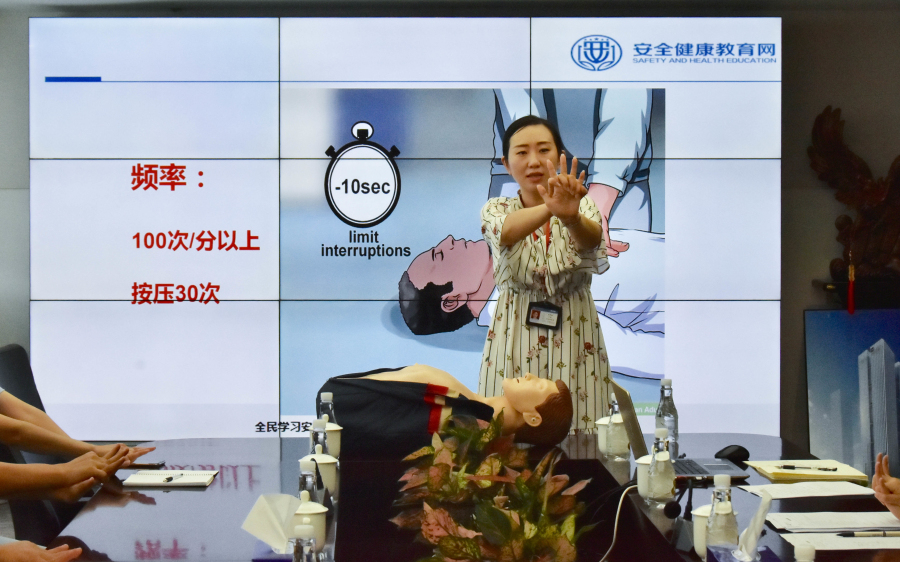 培訓(xùn)期間,蔣老師為讓大家更好地了解當(dāng)今城市救護(hù)的重要性,并能夠在心臟復(fù)蘇的“黃金4分鐘”內(nèi)盡可能發(fā)揮出關(guān)鍵作用,特地采用了理論結(jié)合實(shí)際的授課方式為大家講解CPR(現(xiàn)場心肺復(fù)蘇術(shù)),目的是通過胸外按壓以及人工呼吸使被施救人員心臟復(fù)蘇,以此挽回生命。蔣老師通過嫻熟、詳細(xì)的動(dòng)作指導(dǎo)教學(xué)和CPR假人模擬操作,讓員工們不僅對CPR有了基礎(chǔ)性認(rèn)知,也使員工們多掌握了一項(xiàng)安全應(yīng)急知識。