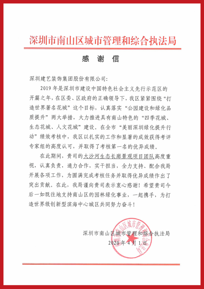 在得知深圳市開(kāi)展“美麗深圳綠化提升行動(dòng)”績(jī)效考核后,建藝集團(tuán)大沙河生態(tài)長(zhǎng)廊景觀項(xiàng)目團(tuán)隊(duì)高度重視,并全力配合、協(xié)助南山區(qū)城市管理和綜合執(zhí)法局開(kāi)展各項(xiàng)相關(guān)工作,最終助力區(qū)城管局圓滿(mǎn)完成考核任務(wù)并取得考核第一名的優(yōu)異成績(jī)。