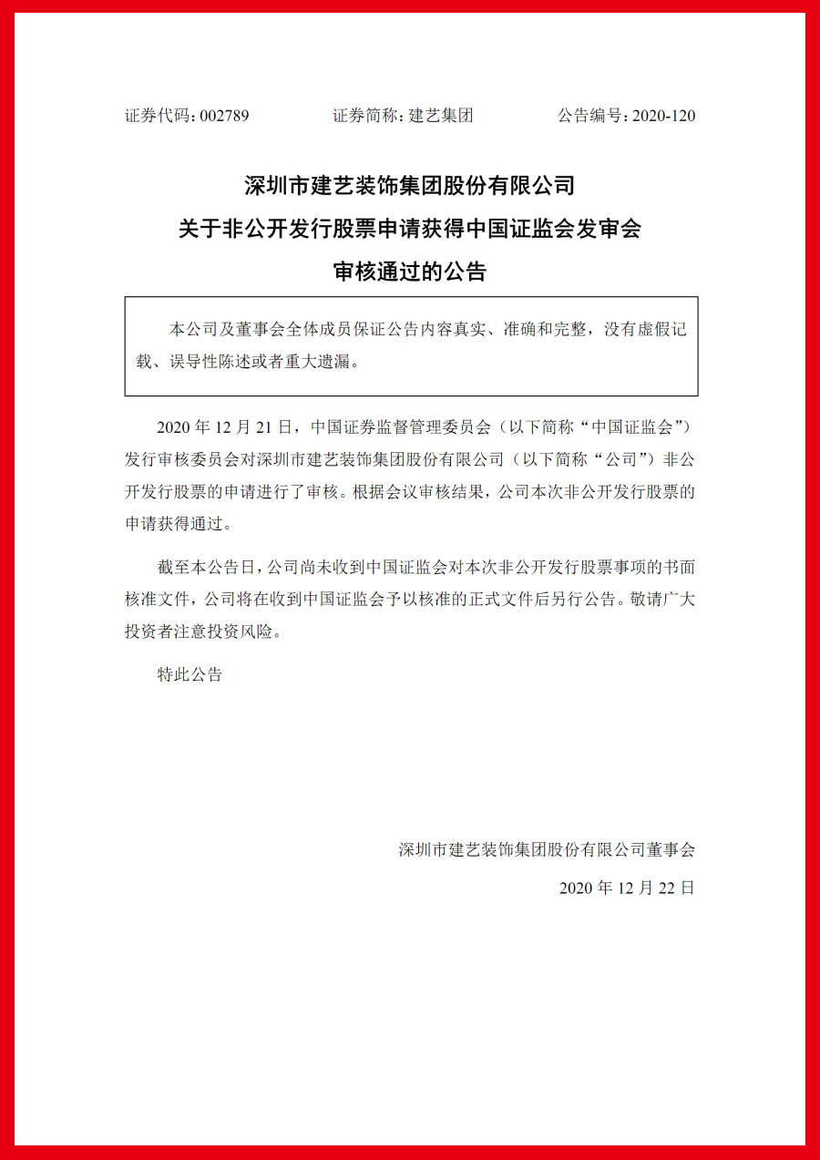 《建藝集團(tuán)關(guān)于非公開(kāi)發(fā)行股票申請(qǐng)獲得中國(guó)證監(jiān)會(huì)發(fā)審會(huì)審核通過(guò)的公告》