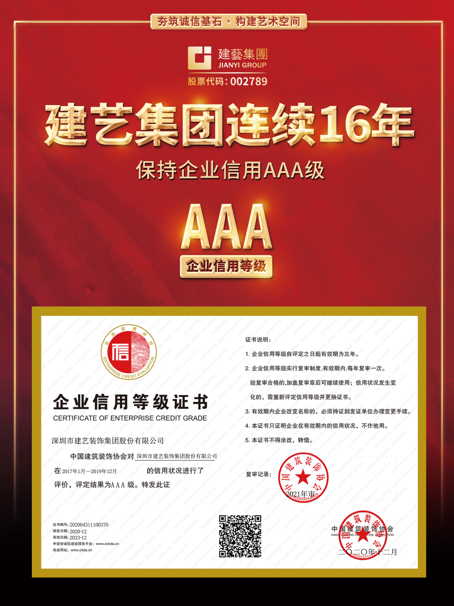 日前,中國建筑裝飾協(xié)會發(fā)布了《2021年度(第二批)建筑裝飾行業(yè)信用評價復(fù)評公告名單》,建藝集團(tuán)等近三百家優(yōu)秀裝飾企業(yè)獲行業(yè)最高信用等級——AAA級評定,這也是建藝集團(tuán)連續(xù)16年保持企業(yè)信用AAA級。