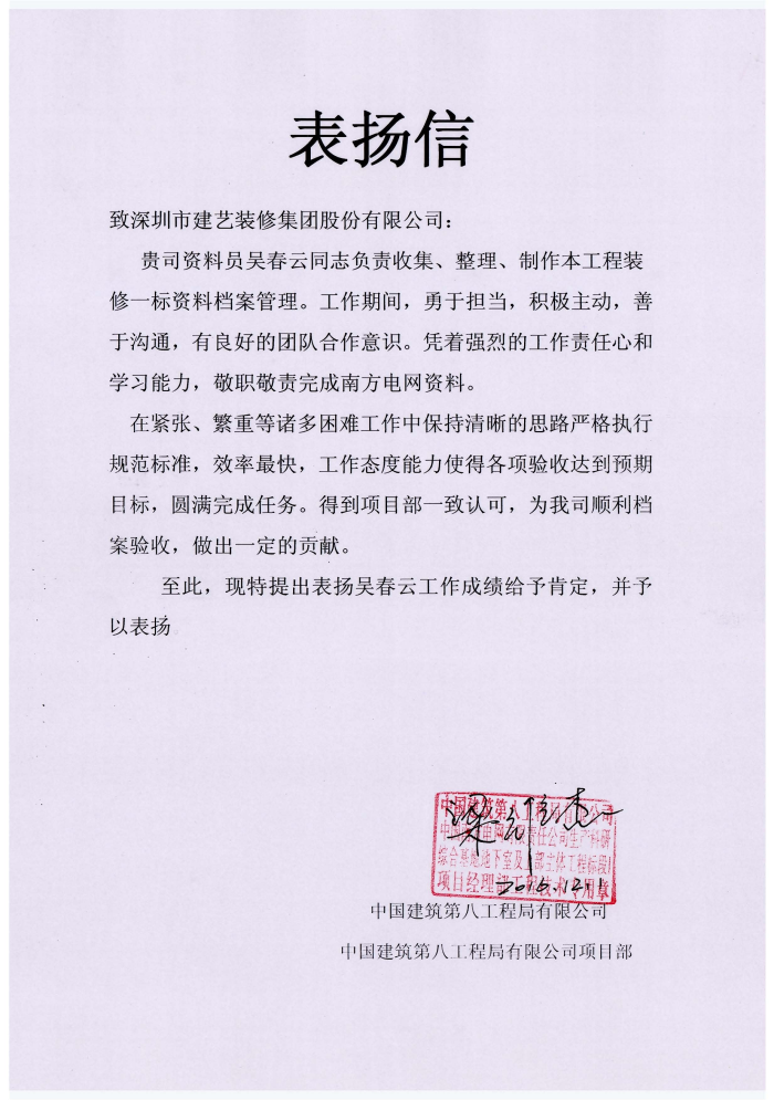 建藝集團(tuán)工程管理中心吳春云獲得的表揚(yáng)信