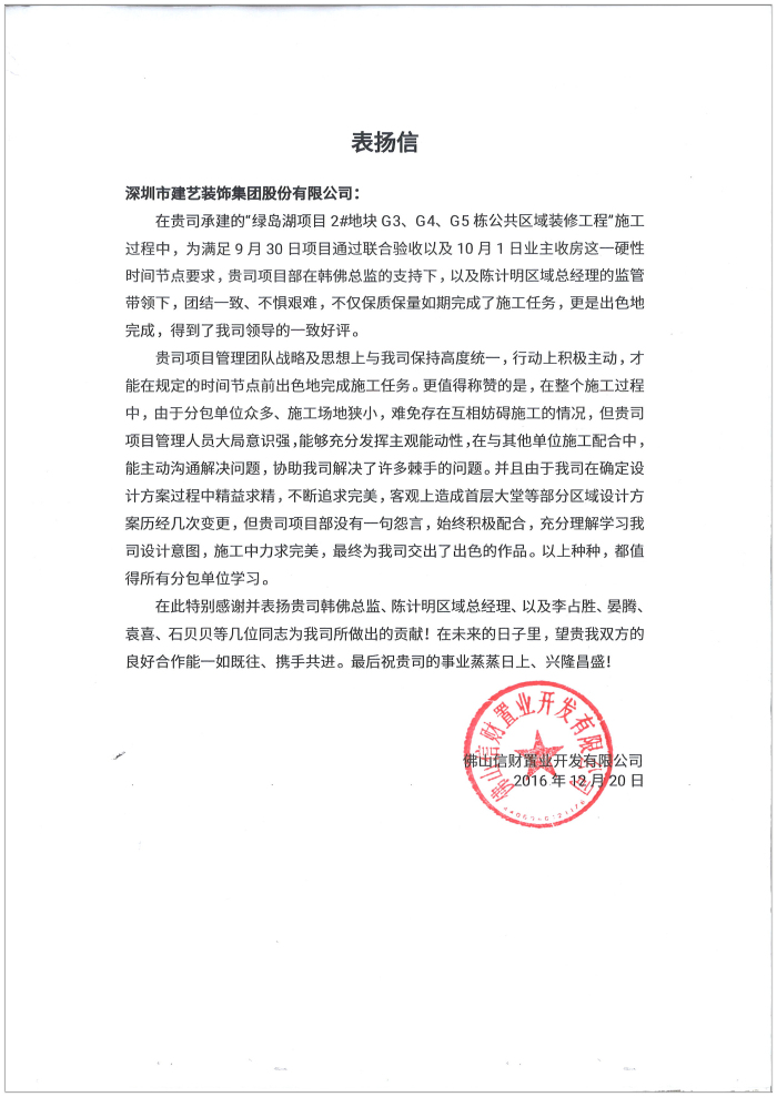 建藝集團(tuán)佛山綠島湖項(xiàng)目管理團(tuán)隊(duì)受甲方高度好評(píng)