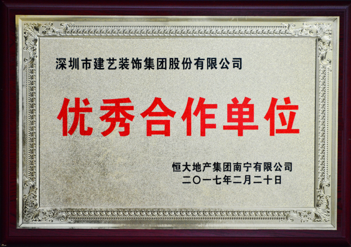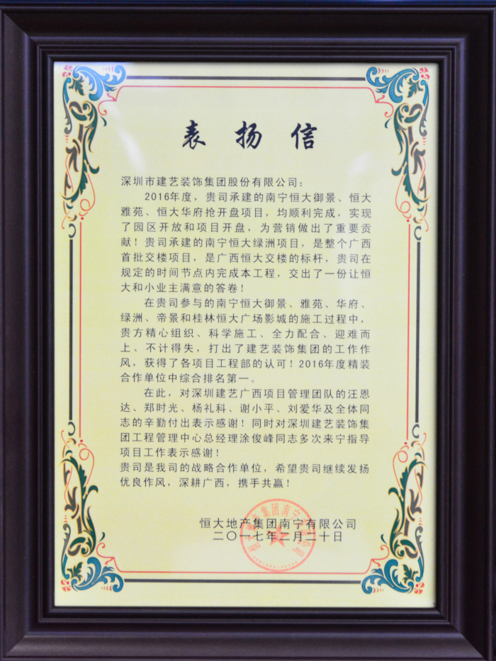 在我司參與的南寧恒大御景、南寧恒大雅苑、南寧恒大華府、南寧恒大綠洲、南寧恒大帝景和桂林恒大廣場影城等項目的施工過程中,我司工程管理人員精心組織、科學(xué)施工、全力配合、迎難而上,充分展現(xiàn)了建藝人的工作作風(fēng),得到了恒大南寧公司上下的一致認(rèn)可及表彰,榮獲 “2016年度精裝合作單位綜合排名第一”、 “優(yōu)秀合作單位”等榮譽(yù)獎牌及表揚(yáng)信,為建藝集團(tuán)贏得了榮譽(yù)!