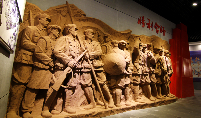 紅軍過雪山的立體墻面,近處幾個紅軍戰(zhàn)士正在行軍中,仿佛要走出來一般,顯得非常逼真,栩栩如生;遠(yuǎn)處則是大部隊(duì)人馬正在翻越雪山的情景。