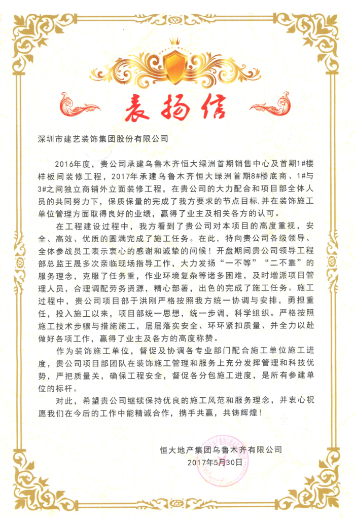 建藝集團(tuán)烏魯木齊恒大綠洲項(xiàng)目部榮獲表彰