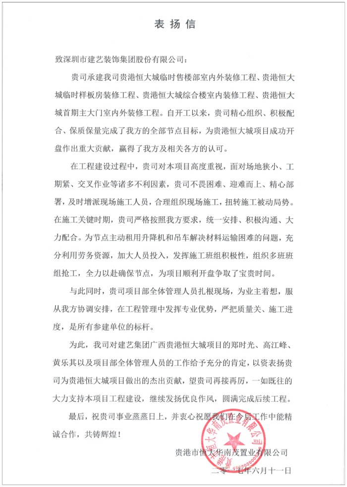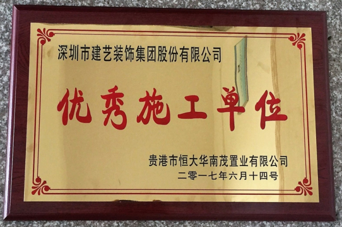 貴港市恒大華南茂置業(yè)有限公司授予建藝集團(tuán)榮譽(yù)獎(jiǎng)牌