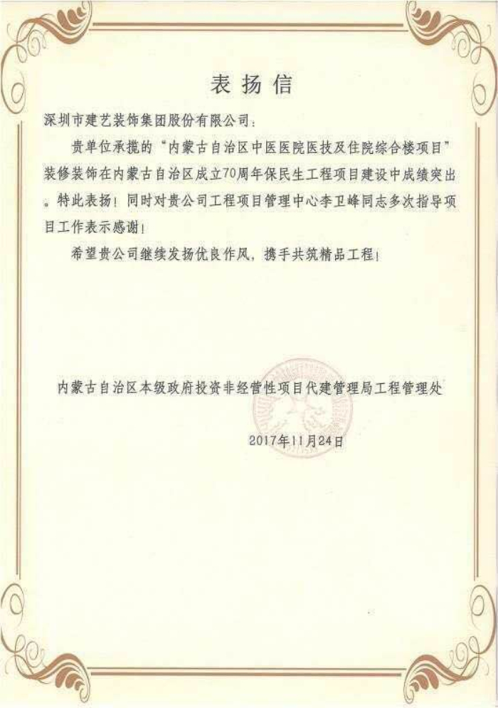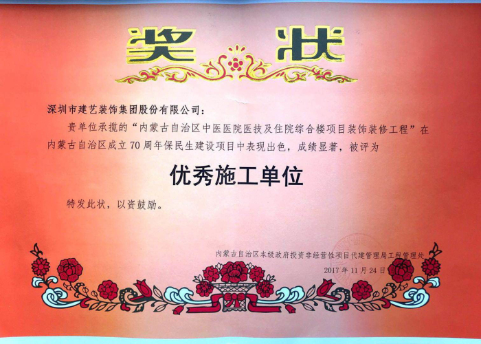 近日,由建藝集團承建的內蒙古自治區(qū)中醫(yī)醫(yī)院醫(yī)技及住院綜合樓項目裝飾裝修工程順利交付。該項目作為內蒙古自治區(qū)成立70周年保民生建設項目,我司在該項目建設過程中憑借精湛的施工技藝及優(yōu)秀的項目管理,被內蒙古自治區(qū)本級政府投資非經營性項目代建管理局評為優(yōu)秀施工單位。同時,工程管理中心李衛(wèi)鋒在項目建設過程中,充分發(fā)揚了建藝人求真務實、盡職盡責的優(yōu)良作風,獲得內蒙古自治區(qū)本級政府投資非經營性項目代建管理局的通報表揚。