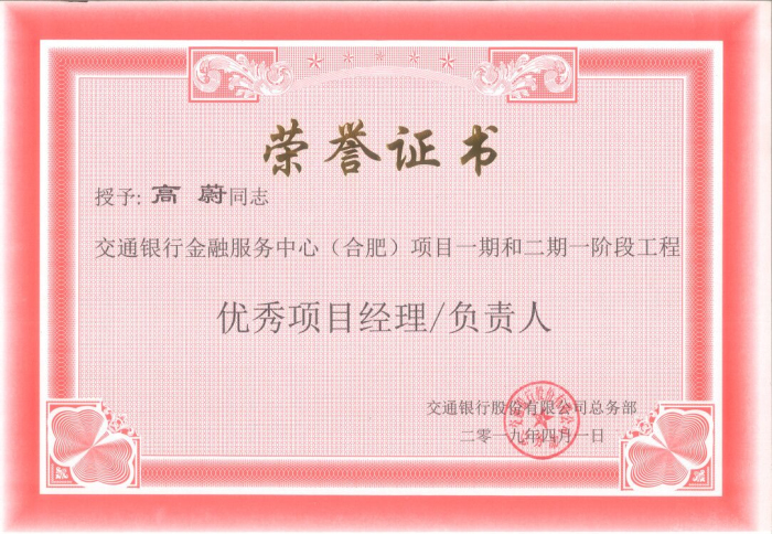 建藝集團(tuán)安徽公司負(fù)責(zé)人高蔚——“優(yōu)秀項(xiàng)目經(jīng)理負(fù)責(zé)人”獎(jiǎng)