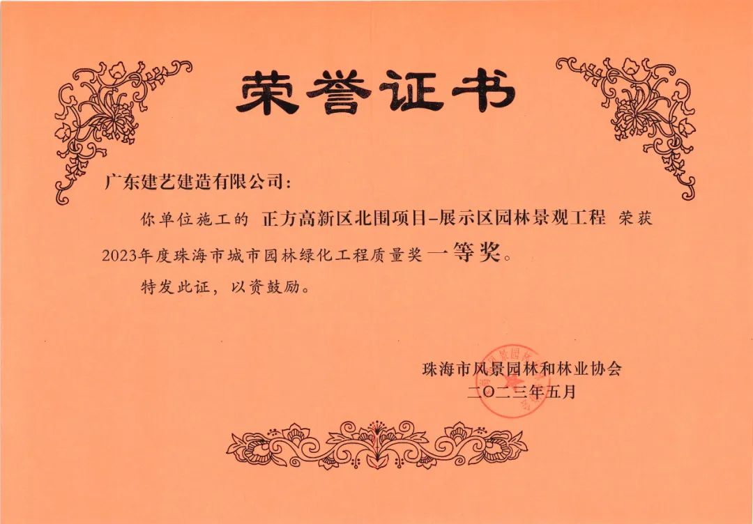 近日,由珠海市風景園林和林業(yè)協(xié)會主辦的珠海市城市園林綠化工程質量獎評選活動落下帷幕,深圳市建藝裝飾集團股份有限公司旗下廣東建藝建造有限公司承建的正方高新區(qū)北圍項目-展示區(qū)園林景觀工程榮獲“2023年度珠海市城市園林綠化工程質量獎”一等獎。