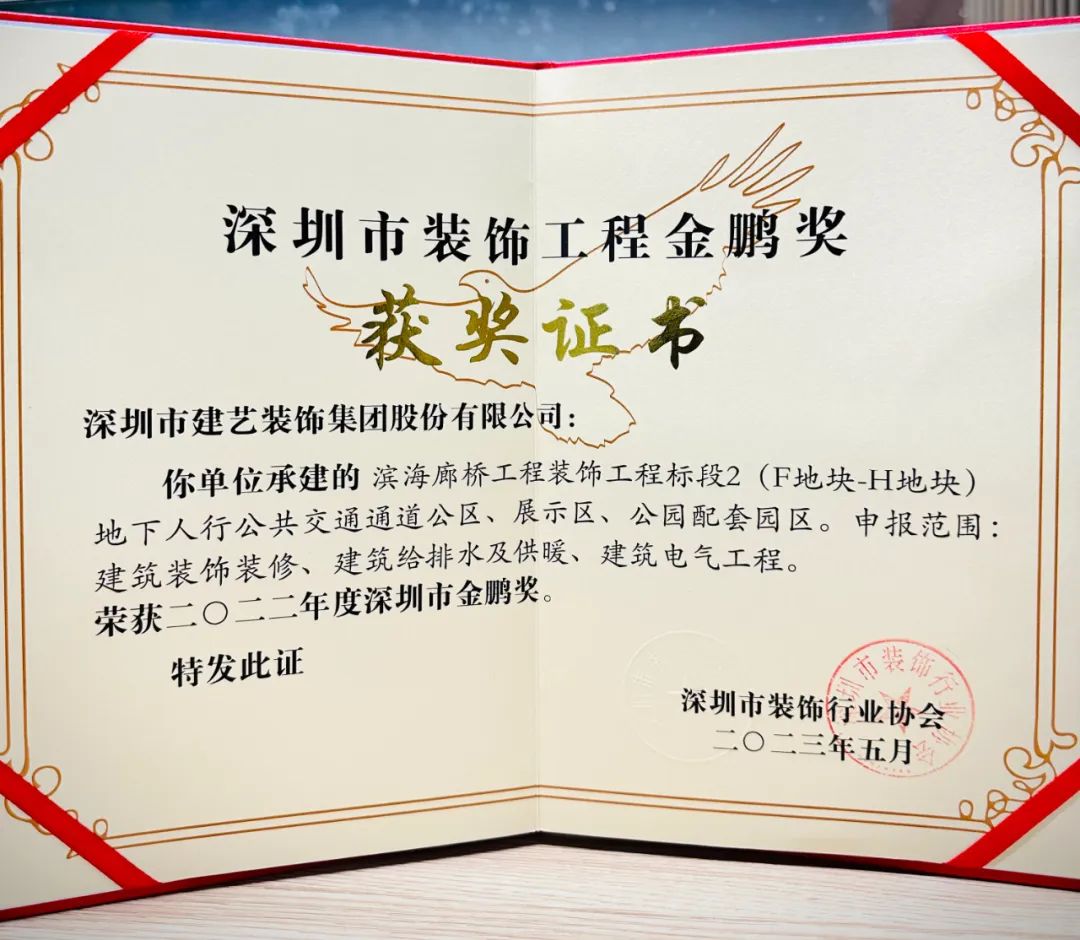 【喜訊】建藝集團項目濱海廊橋裝飾工程榮獲深圳市裝飾工程金鵬獎