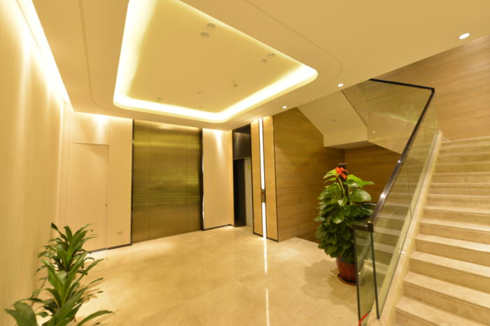 在建藝集團項目人員的精心施工下,此項目的最終完成效果可謂是非常驚艷。前臺接待大廳全部采用西班牙米黃大理石,鑲嵌上紅色大字“華耀城”,顯得分外耀眼。為了實現(xiàn)設(shè)計要求的特殊紋路藝術(shù)效果,建藝集團項目人員對墻面石材板塊進行了人工琢打加工,使用專用于石材荔枝面處理的氣動荔枝錘進行敲打,精雕細琢,使原本較為光滑的雕刻面呈現(xiàn)出自然的波浪形紋路效果,每一塊石材都獨一無二。