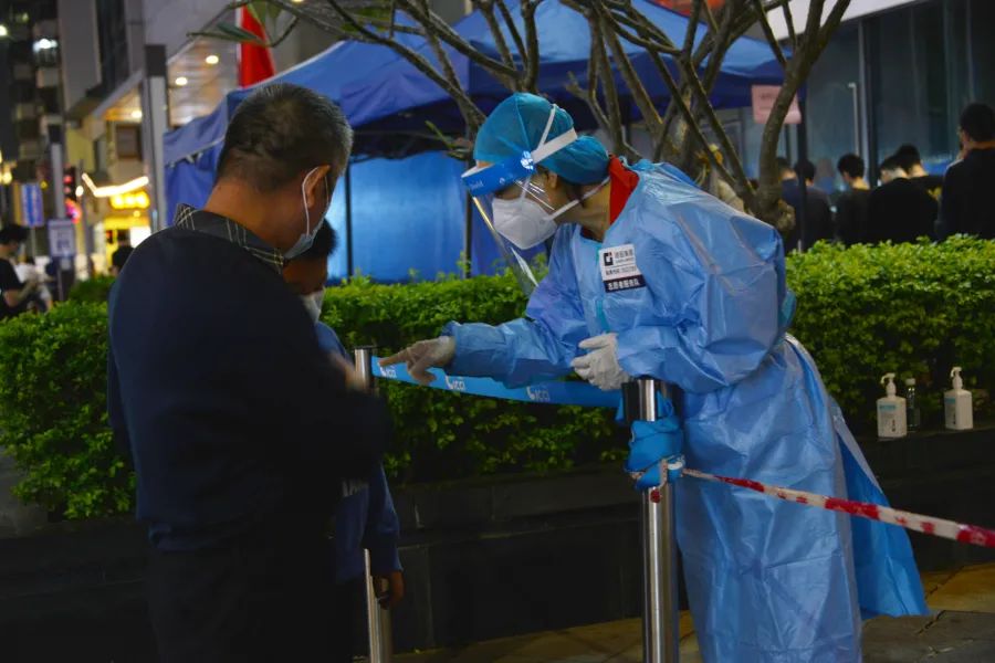 組圖:夜幕降臨,李媛娣(左)等建藝志愿者在核酸檢測點持續(xù)服務(wù)