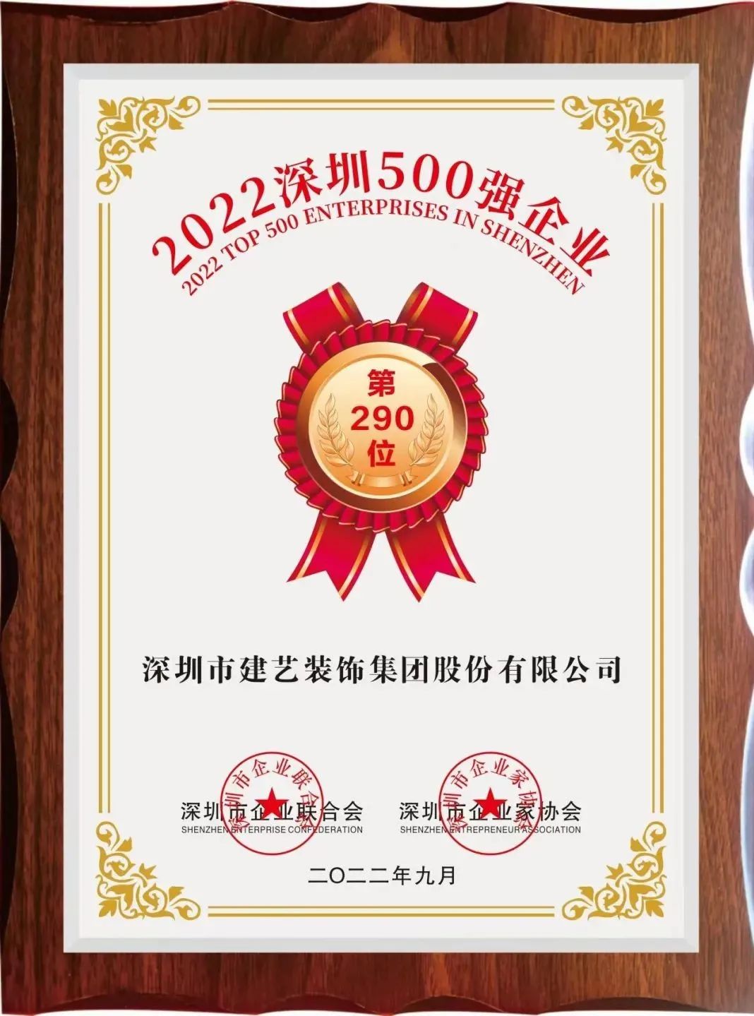 9月21日,深圳市企業(yè)聯(lián)合會、深圳市企業(yè)家協(xié)會發(fā)布“2022深圳企業(yè)500強(qiáng)榜單”及《2022深圳500強(qiáng)企業(yè)發(fā)展報(bào)告》。中國平安、華為、騰訊等多家知名企業(yè)上榜,深圳市建藝裝飾集團(tuán)股份有限公司(股票代碼:002789)憑借行業(yè)引領(lǐng)力、品牌影響力、社會責(zé)任擔(dān)當(dāng)?shù)染C合實(shí)力,再度蟬聯(lián)“深圳500強(qiáng)企業(yè)”。自2017年至今,建藝集團(tuán)已連續(xù)五年榮登500強(qiáng)企業(yè)榜單。