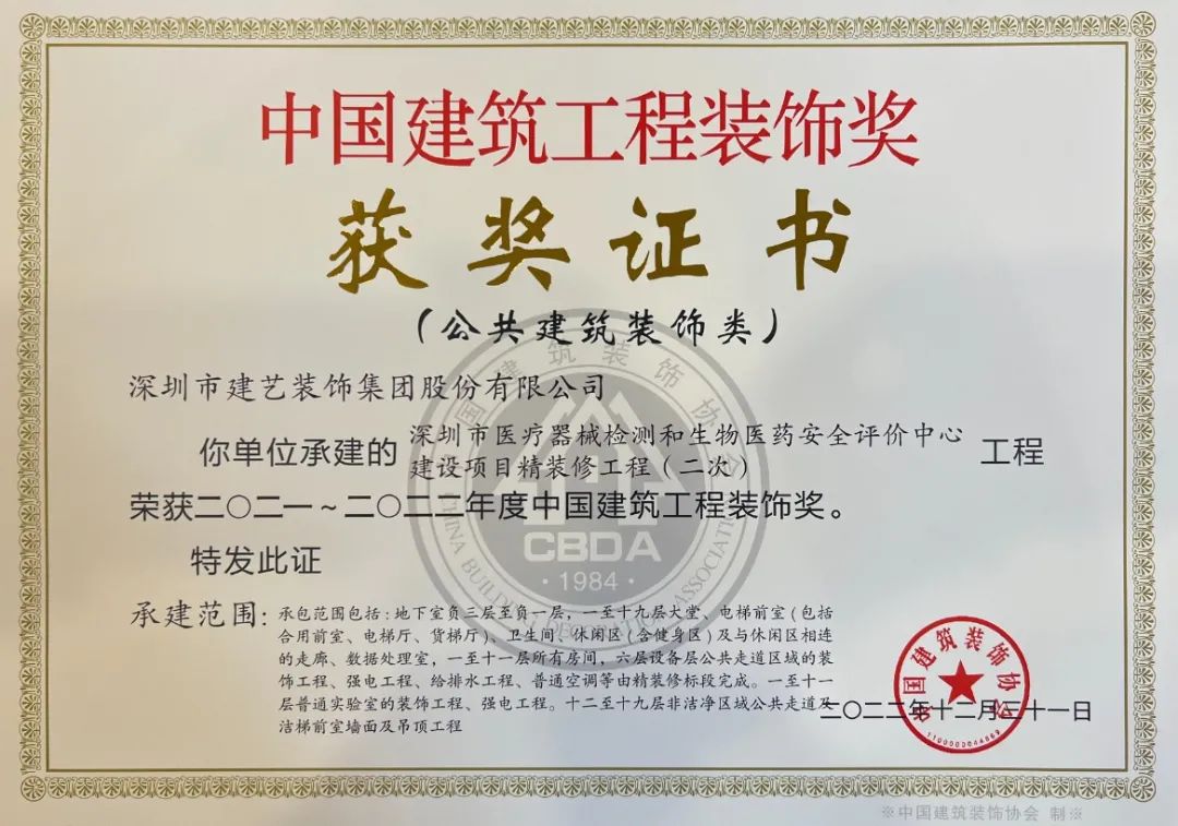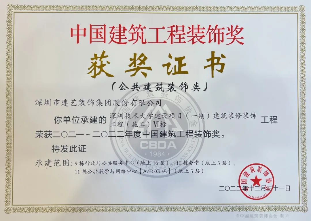 3月23日,由建藝集團(tuán)參建的深圳技術(shù)大學(xué)(一期)建筑裝修裝飾工程Ⅵ標(biāo)段(簡(jiǎn)稱深圳技術(shù)大學(xué)項(xiàng)目)和深圳市醫(yī)療器械檢測(cè)和生物醫(yī)藥安全評(píng)價(jià)中心項(xiàng)目(簡(jiǎn)稱深圳藥檢大廈項(xiàng)目)再獲殊榮,榮獲由中國(guó)建筑裝飾協(xié)會(huì)評(píng)選頒發(fā)的全國(guó)建筑裝飾行業(yè)最高榮譽(yù)獎(jiǎng)項(xiàng)——“中國(guó)建筑工程裝飾獎(jiǎng)”。