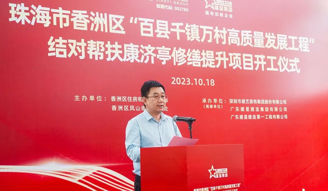 珠海市香洲區(qū)鳳山街道黨工委副書記、辦事處主任成平川發(fā)表致辭。他表示,自“百千萬工程”實施以來,鳳山街道加大城鄉(xiāng)區(qū)域統(tǒng)籌力度,促進(jìn)發(fā)展空間集約利用、公共資源均衡配置、基本公共服務(wù)均等覆蓋,致力于補齊發(fā)展短板。鳳山街道注重廣泛調(diào)動社會力量,并得到了相關(guān)上級領(lǐng)導(dǎo)、部門和有關(guān)單位的大力支持。感謝建藝集團(tuán)與建星集團(tuán)對本次提升工程的結(jié)對幫扶,勇?lián)鐣?zé)任,發(fā)揮自身資源優(yōu)勢,成為推進(jìn)“百千萬工程”的強(qiáng)大助力。