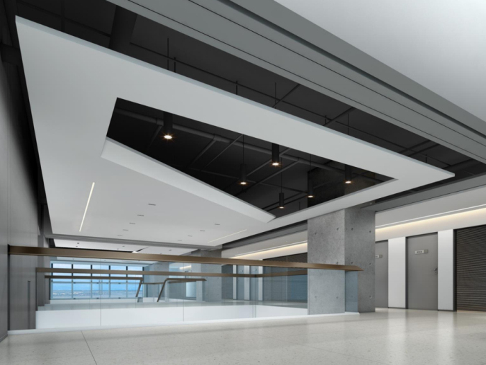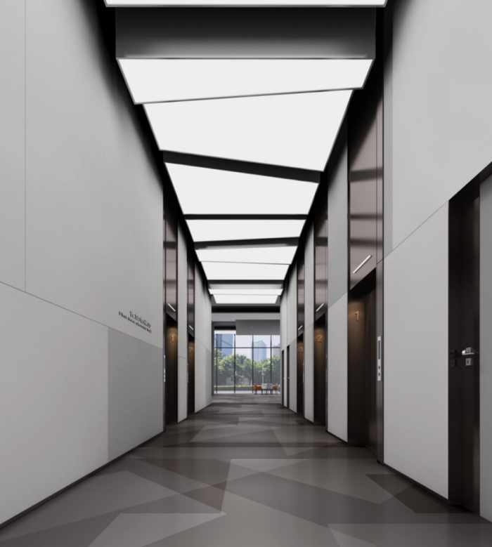 二層大廳:面向通高大廳的核心筒墻面,成為跨越多層的視覺中心。具有抽象浮雕藝術(shù)感的墻面,較好地凸顯了空間的可視性和美學(xué)深度。