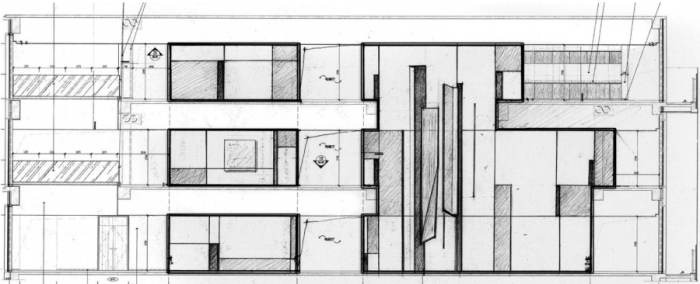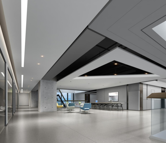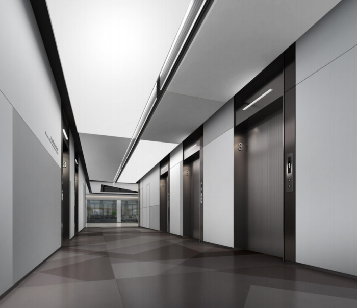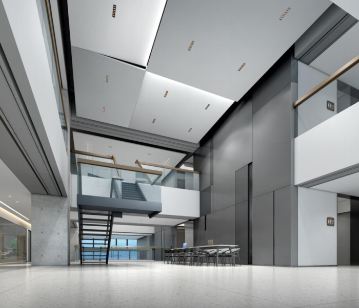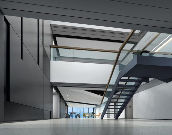 二至四層大廳主立面:中灰度分色墻面,深色凹槽、錯(cuò)落有致的線條分割,干凈利落、簡(jiǎn)約現(xiàn)代,增添了空間的厚實(shí)感、設(shè)計(jì)感、藝術(shù)感、秩序感、工業(yè)感,嚴(yán)謹(jǐn)?shù)脑O(shè)計(jì)手法既新穎又現(xiàn)代。