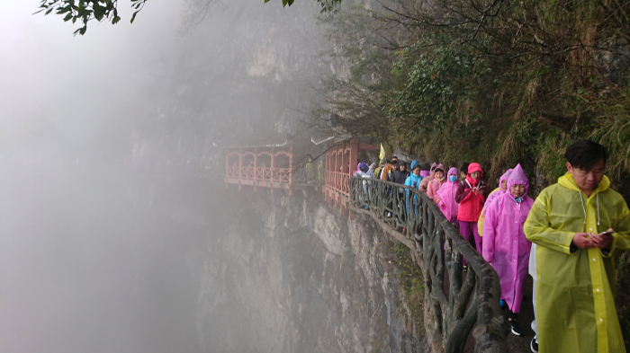 四月的天,喜怒無(wú)常,讓人琢磨不透。登天門山前往玻璃棧道與鬼谷棧道的過(guò)程中,山上風(fēng)雨交加,云霧蒙蒙。整個(gè)天門山系就猶如含羞的少女,猶抱琵琶半遮面,隱藏在煙雨中。而此時(shí)此刻的天門山頂景區(qū),也宛如仙境一般迷人。置身于云霧中的建藝人,穿著五顏六色的雨衣,在云雨中彼此攜手結(jié)伴,奮勇前進(jìn),成為了景區(qū)的一道“獨(dú)特風(fēng)景線”。